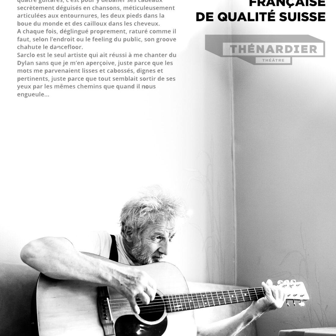 Dans cette conférence chantée, Sarclo, disciple modeste mais forcené, distille en chansons personnelles les leçons qu’il a reçues de son daron, et se permet de les faire suivre de chansons du maître, versions bilingues.