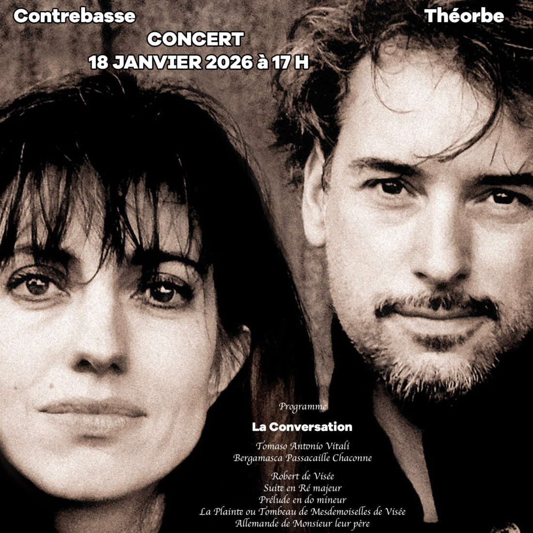 Nous poursuivons dans un 17ème siècle français, âge d’or du luth, ou le théorbe devient soliste et la contrebasse accompagnatrice grâce aux arrangements par nos soins des pièces de Robert De Visée, en particulier avec la pièce « La Conversation », titre de notre programme qui évoque à merveille le charme de la rhétorique du luth.